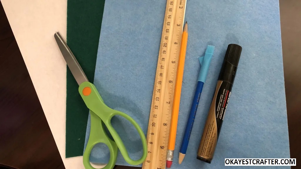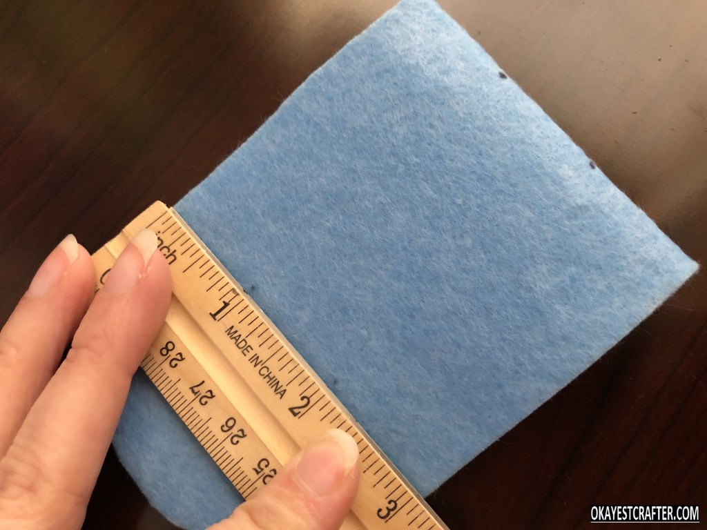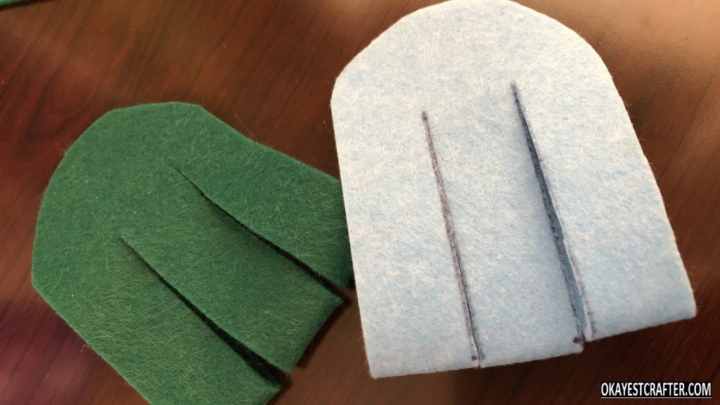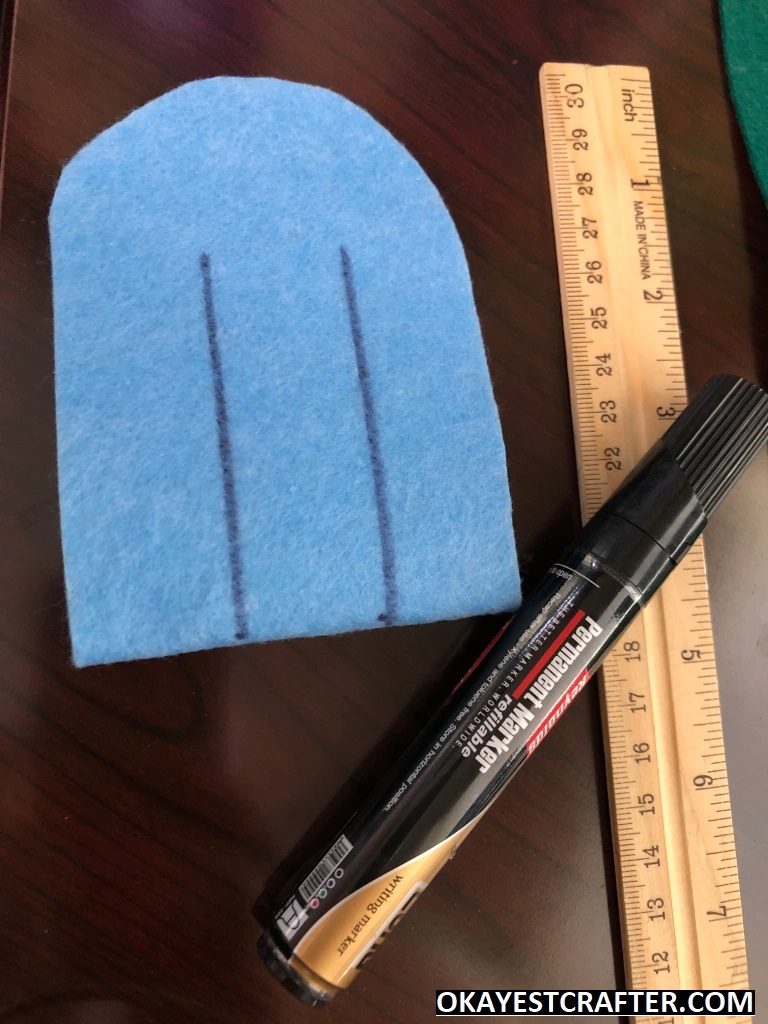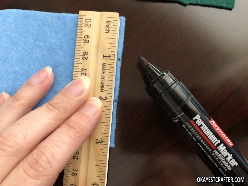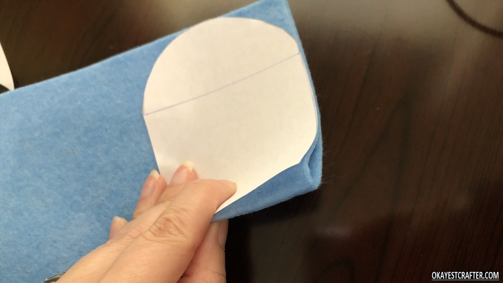 Fold one color of felt in half. Make sure to fold it and be aware of where the crease is. This is critical or it will not work. Place the bottom of the square on the crease and trace the shape with the marker or fabric pencil.