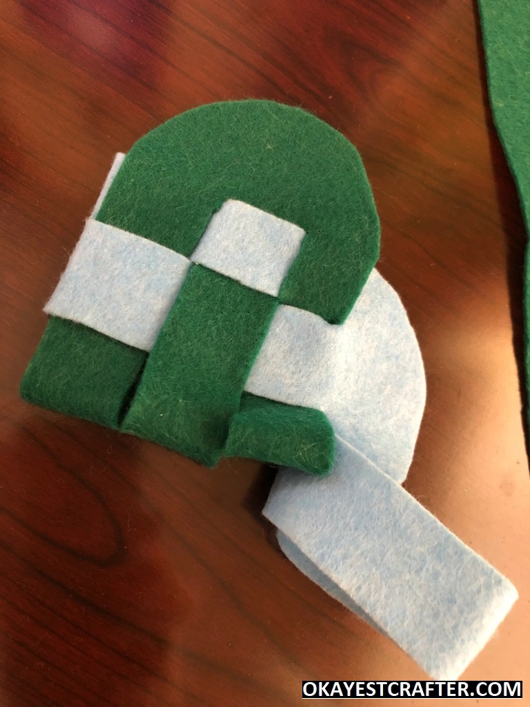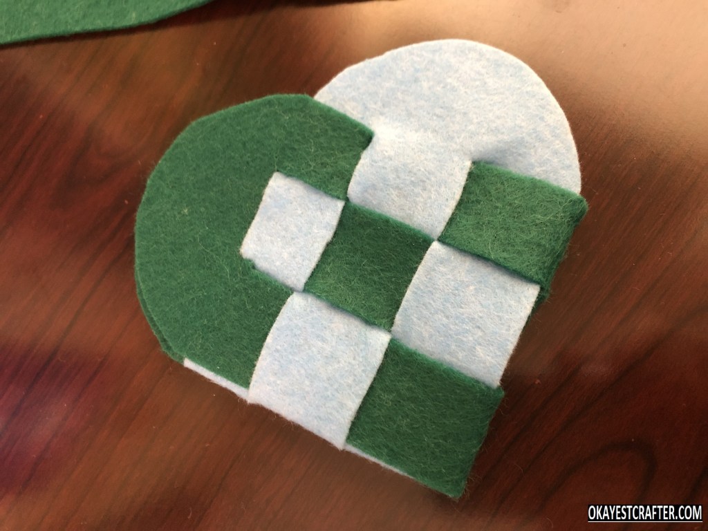 Starting with one strip at a time, weave the pieces in and out, alternating the pattern for each strip, until all three are done.