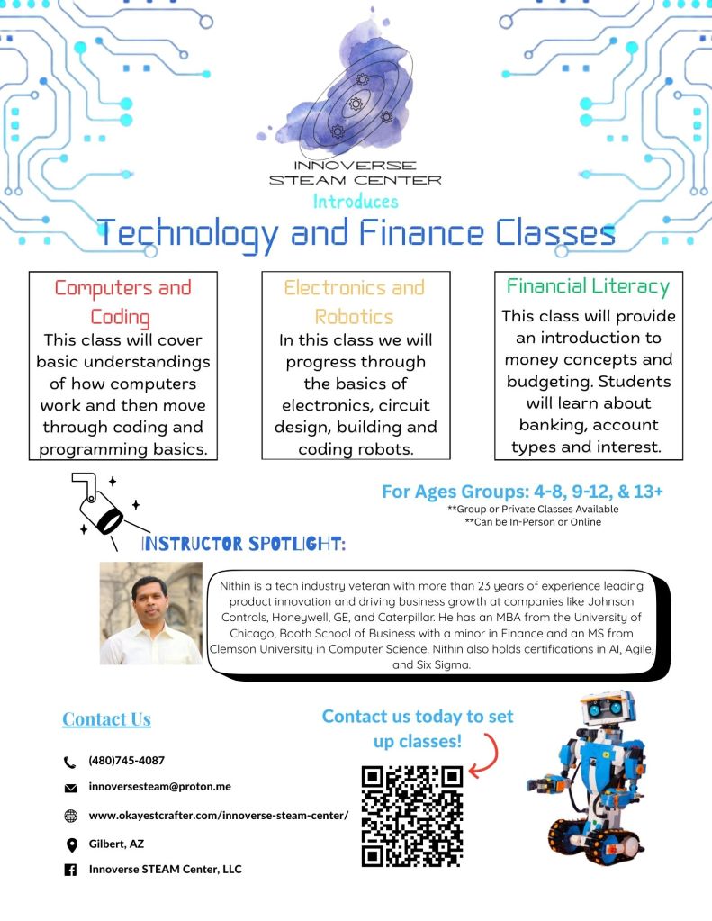 Innoverse STEAM Center is excited to announce the newest Technology and Finance Classes! Contact us today for a quote!